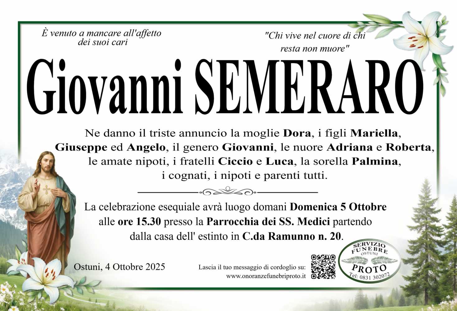 Lascia gratuitamente un messaggio di cordoglio, sarà nostra cura consegnarlo ai congiunti di GIOVANNI SEMERARO.